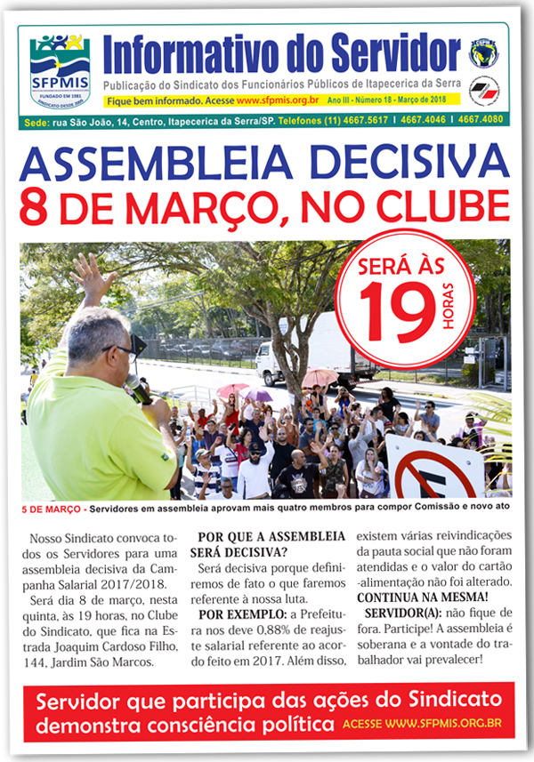 Adalberto afirma: "Agradeço a presença dos Servidores que fortelecem nossas ações e dos dirigentes que apoiaram a assembleia. Deixo aqui a convocação a todos os trabalhadores para o encontro decisivo do dia 8, às 19 horas, na sede do Sindicato. É fundamental que todos estejam presentes, pois a deliberação dos companheiros definirá o andamento da Campanha Salarial. Eu e toda a diretoria do SFPMIS contamos com a presença maciça da categoria".