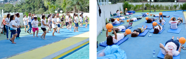 ZUMBA E PILATES - As últimas atividades foram as aulas de zumba e pilates. As Servidoras desceram para o espaço da piscina e partiram para a dança. Foi um momento de descontração e alegria entre todas as mulheres. Para finalizar, houve um segundo sorteio de brindes que foram entregues por nossas dirigentes.